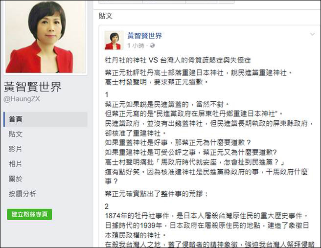 【观察者网综合】2月3日,台湾名嘴黄智贤于脸书发文,表示台湾有部份人士得了历史认知上的“骨质疏松症与失忆症”,其特征是身子骨瘫软,动不动就鞠躬哈腰;另一方面,对“被殖民”的屈辱失去记忆,怀古念旧总是追溯到“日据时代”。