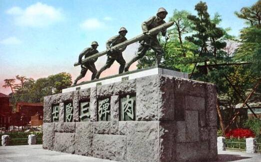 1932年2月22日,淞沪前线,日军第24混成旅团在庙行镇方向所发动的攻势遭到了来自中国军队的顽强抵抗。眼见部队久攻不下,作江伊之助、北川丞、江下武这三位来自独立第18工兵大队的普通士兵抱着"爆破筒"向架设在中国军队阵地前铁丝网冲了过去,企图为后续部队打开一条进攻通道。最终,他们成功地打炸开了一个缺口。据说,在被中国军队射来的机枪子弹打死之前,他们之中的一个还喊了声"天皇万岁"……