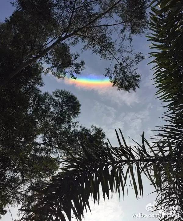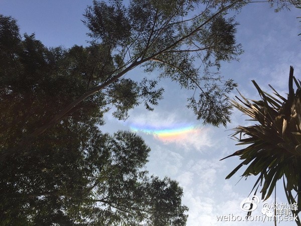 (@广州天气:“环天顶弧”是以天顶为中心,位于一水平面上的发光圆弧构成的大气光学现象。环天顶弧一般是由太阳光照在细小的冰晶上折射后形成的)