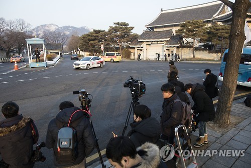 2月3日清晨,青瓦台前聚集大批媒体记者。来源:韩联社