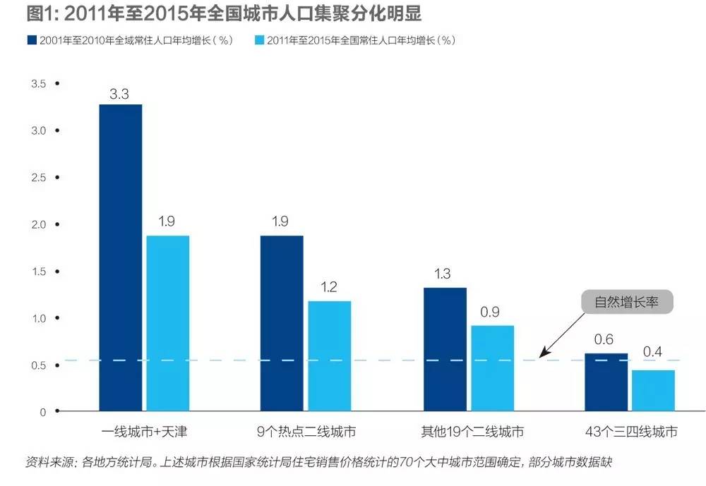 2011年以来,随着城市化进入中后期,中国城市人口聚集速度整体放缓,分化日趋明显。2011年-2015年,北上广深四个一线城市及天津全域常住人口年均增长1.9%,较2001年-2010年的3.3%明显下降,但增速仍然最高。9个热点二线城市全域常住人口年均增速从之前的1.9%降至1.2%,其他19个二线城市年均增速从之前的1.3%降至0.9%,43个三四线城市年均增速从之前的0.6%降至0.4%。需要指出的是,2001年-2010年、2011年-2015年全国人口年均增速分别为0.57%、0.50%,这也即人口自然增长率。这意味着三四线城市人口逐渐从之前的小幅净迁入转为明显净迁出,整体上进入人口停滞乃至人口萎缩阶段。(见图1)