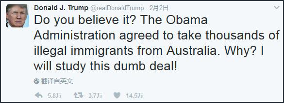 不久后,特朗普发推特,爆粗口称美澳难民协议是个“傻X”协议。他称,“你相信吗?奥巴马政府同意从澳大利亚接收几千个非法移民,什么原因?我要好好研究这个傻X的交易。”这条推文似乎更坐实了这些报道的真实性。