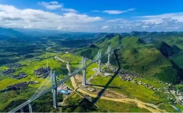 北盘江大桥,2016年12月29日正式建成通车,它横跨云贵两省,全长1341.4米,桥面到谷底垂直高度565米,成为目前世界第一高桥。同时,大桥东、西两岸的主桥墩高度分别为269米和247米,720米的主跨也仅次于后期开工建设的贵(阳)黔(西)高速公路鸭池河特大桥, 在同类型桥梁主跨的跨径中排位世界第二。