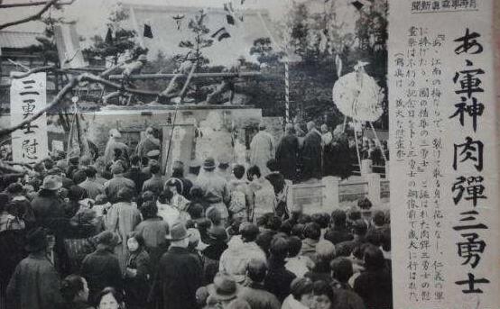 1932年2月22日,淞沪前线,日军第24混成旅团在庙行镇方向所发动的攻势遭到了来自中国军队的顽强抵抗。眼见部队久攻不下,作江伊之助、北川丞、江下武这三位来自独立第18工兵大队的普通士兵抱着"爆破筒"向架设在中国军队阵地前铁丝网冲了过去,企图为后续部队打开一条进攻通道。最终,他们成功地打炸开了一个缺口。据说,在被中国军队射来的机枪子弹打死之前,他们之中的一个还喊了声"天皇万岁"……