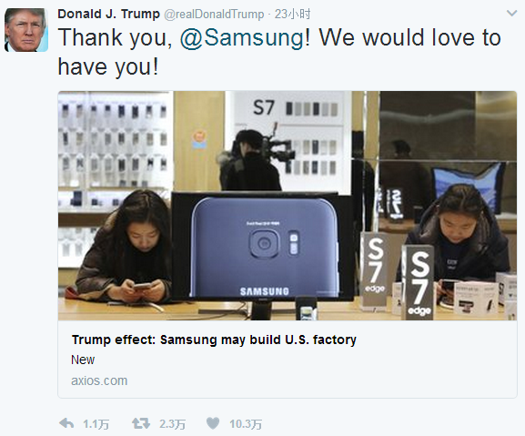 2017年2月3日,美国总统大人特朗普先生在当地时间2月2日更新了这样一条推特“谢谢你三星!我们非常愿意接纳你!”,那用后脚跟想想都知道三星肯定是计划在美国建厂扩招了。特朗普这条推特感觉就像是三星给正在斗鱼直播的特朗普刷了个大火箭,然后特朗普双手抱拳,说:“谢谢老铁三星!”
