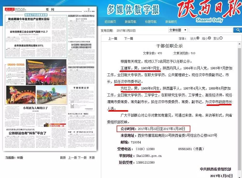 政知圈(微信ID:wepolitics)研究了一下,发现与公示时间有关。在魏增军当选副省长两天后,1月22日,《陕西日报》2版刊登了一则《干部任职公示》,公示涉及两名干部即王建军、方红卫。公示时间为2017年1月22日至2017年1月26日。