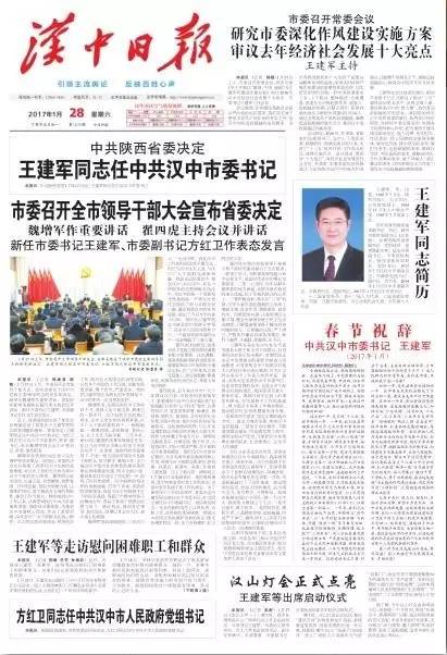 1月28日的《汉中日报》头版内容丰富,共8条新闻,7条都与新任市委书记王建军有关,其中就包括新书记的新年祝辞。