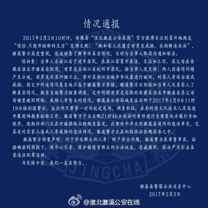 @淮北濉溪公安在线:#情况说明#濉溪县公安局对网友@佳怡-只想开始新的生活发博求助称遭受前男友威胁一事的情况说明。