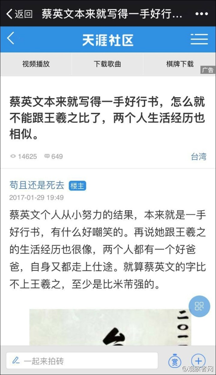 4.【蔡英文“自自冉冉”春联大卖曾被赞“当代王羲之”】去年年底,蔡英文春联题词“自自冉冉、欢喜新春”被指没文化,原文应是“自自由由”。但因这次春联因话题性十足,反而更加抢手,“总统府”准备的二十五万份春联在两周内就发了近九成,到小年夜前几乎完全发光。前民进党“立委”邱垂贞更曾盛赞蔡英文字写得好,称“现代王羲之也不过如此”。