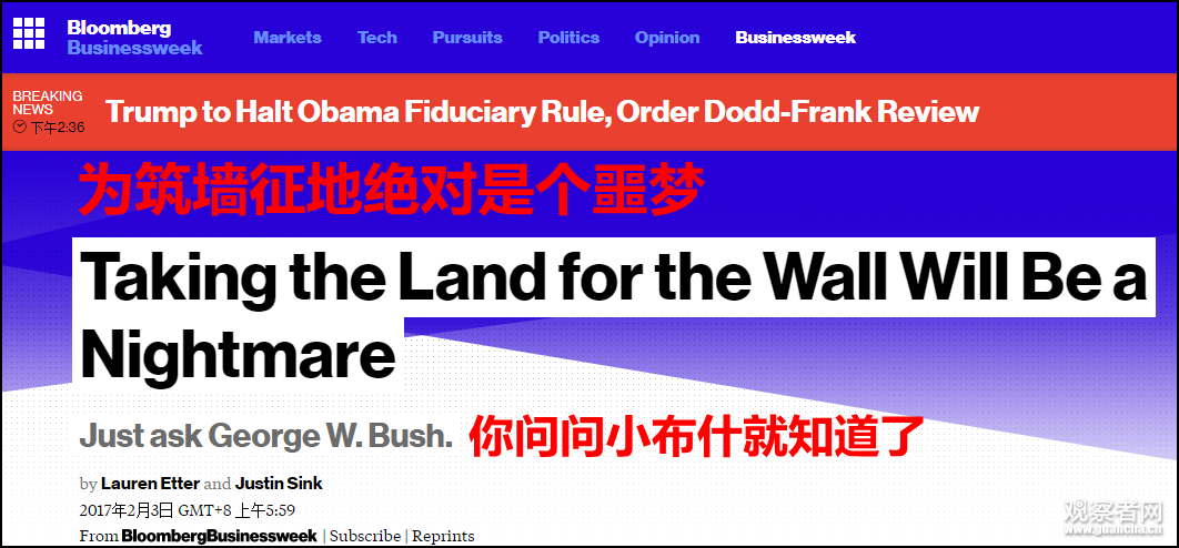 本来为了阻挡墨西哥非法移民偷渡的隔离墙,最后很可能要依赖墨西哥人才能建起来。但在彭博社的眼里,特朗普雄伟计划面临的阻碍并不只有这一个。