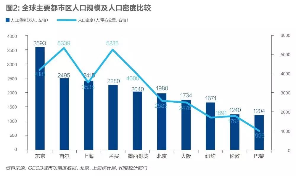当前全球前六大都市区分别为:东京都市区(3593万人)、首尔都市区(2495万人)、上海市(2415万人)、孟买都市区(2280万人)、墨西哥城都市区(2040万人)、北京都市区(不含生态涵养发展区,1980万人)。相应的土地面积分别为:8592、4673、6883、4355、5102、7664平方公里,人口密度分别为4181、5339、3535、5235、4000、2583人/平方公里。